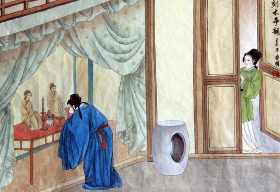 丁兰的妻子时间一长就开始不敬重了,用针戏谑地刺木像的手指,竟然流出血来。木像见到丁兰来了,眼中还居然掉下了眼泪。丁兰询问得到真相,于是把妻子休了。