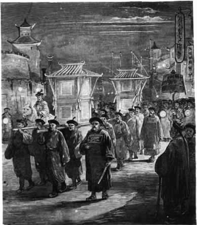 每天早晨,成群的北京人都出来看皇帝布置房间的物品,整个路上从头到尾两边都是人。有天早晨,所抬物品特别贵重,因此整个队伍在天亮之前就已行动,没赶上瞧热闹的人未免大失所望。据说,这是为了防止发生抢夺事件。