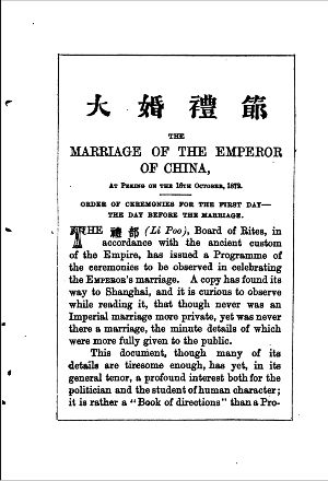 对于同治大婚,当时外国人极感兴趣,他们甚至将清廷公布的一些礼节译成英文并出版。英国《伦敦新闻画报》特别邀约英国人威廉·辛普森作为通讯员,提供费用,派他前往中国,探个究竟。